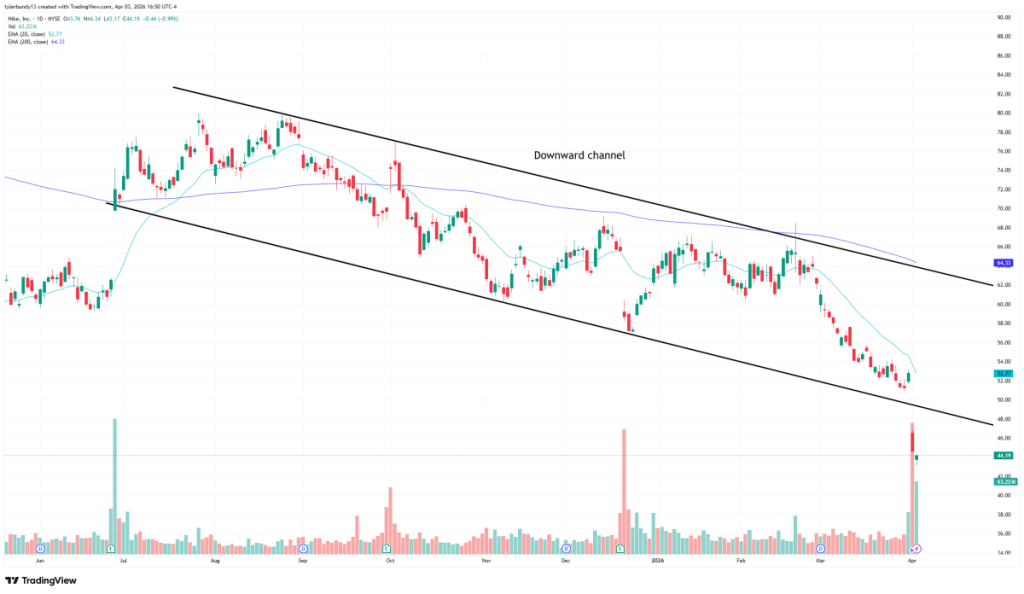 Trading View The latest move makes the setup more serious. Nike has now broken below the lower end of that channel instead of simply bouncing inside it again. In the most recent session, the stock opened at $43.76, traded as high as $44.34, fell to $43.17, and closed at $44.19. The 20-day EMA sits at $52.77 and the 200-day EMA at $64.33, leaving Nike well below both trend markers. That is a bearish alignment and shows the stock is trading with weak short-term momentum inside a much weaker long-term trend.